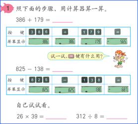 (1)要使学生学会用计算器进行加、减、乘、除等基本的四则运算,了解运算键的功能,会进行操作。例题中只呈现加、减法计算的例子,按键数字和屏幕显示的结果对应出现;乘除法式题由学生自己尝试操作。