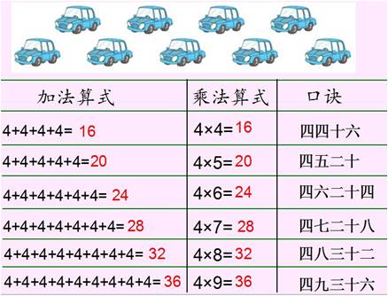 小结:第一个数相同(都是4);第二个数是相邻的两个数,相差1;口诀的得数都相差4。