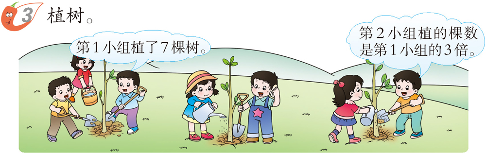 用画一画、摆一摆等方法弄清第2小组植的棵树是第1小组的3倍的意思。得出结论第2小组植的棵树:7×3=21(棵)