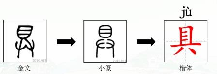 甲骨文字形,上面是鼎,下面是双手,表示双手捧着盛有食物的鼎器(餐具)。要写好这个字,应该注意什么?“具”,强调“具”字里面共有三横。